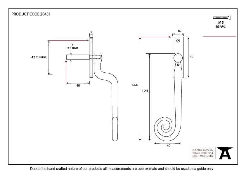 Fixing Plate Size: 55mm x 16mm x 5mm Our range of monkeytail espagnolette fasteners offer a traditional looking product with the benefits of a modern and secure configuration. Designed to fit any type of window, including uPVC and timber due to its slim fixing plate. Can be matched with the monkeytail stays in the range. The handle is cranked forwards to ensure this protrudes far enough from the window for ease of use. The product is handed and therefore care needs to be taken when choosing the correct hand. From the inside view, if your window is hinged on the left then a left-hand fastener is required. They have a 7mm² x 40mm spindle and can be locked by way of a grub screw. Can be used with an espagnolette gearbox & window lock. Supplied with matching SS M5 screws.