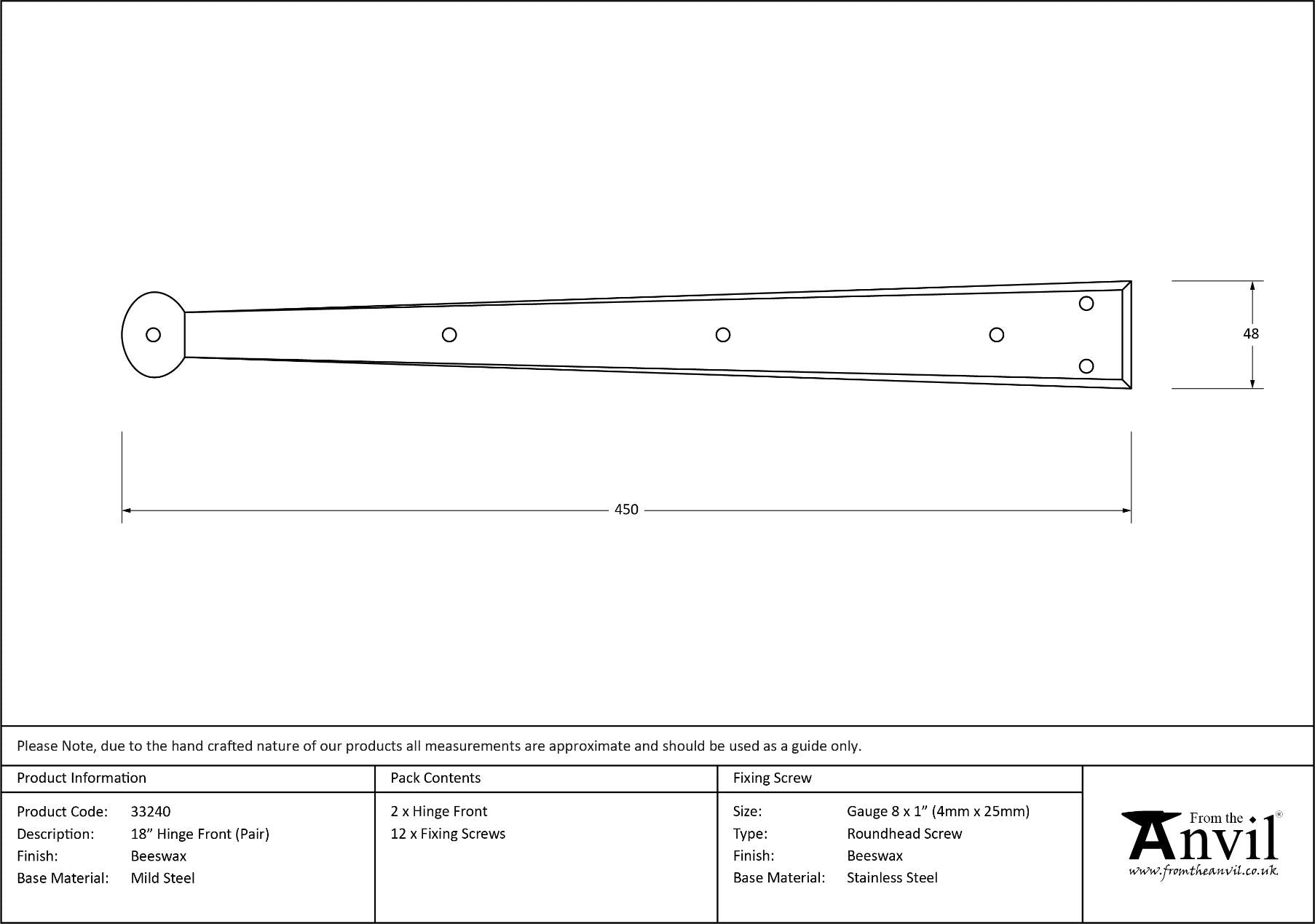 Overall Size: 457mm x 51mm Our hinge fronts can be paired with butt hinges to give a traditional look and feel to an existing or new door. Our blacksmith hinge fronts are hammered into shape from mild steel using the traditional manufacturing method of an anvil and fire. Supplied as a pair. Supplied with matching SS wood screws.