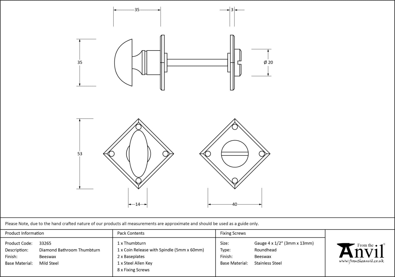 Spindle Size: 5mm Our thumbturns offer an added feature to any door where privacy is required, a perfect solution for bathroom doors. Each of our thumbturns have been designed to complement our range of mortice knob sets and lever on rose handles. Maximum door thickness: 47mm Works with bathroom mortice lock or stand-alone with a tubular deadbolt. Supplied with matching SS wood screws.
