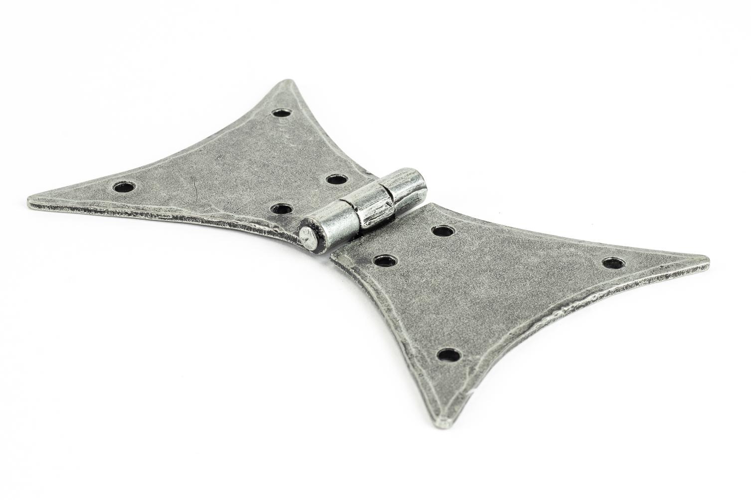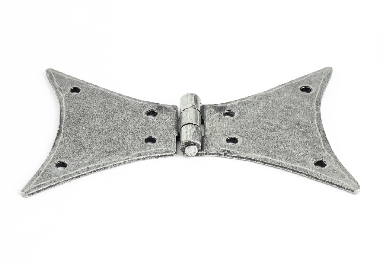 Hinge Arm: 83mm x 57mm A decorative hinge with 'wings' resembling those of a butterfly. Perfect for enhancing the look of any kitchen cupboard or piece of ornamental furniture. A pair and a half (3 hinges) can be fitted to provide extra strength for heavier applications. Supplied as a pair. Supplied with matching SS wood screws.