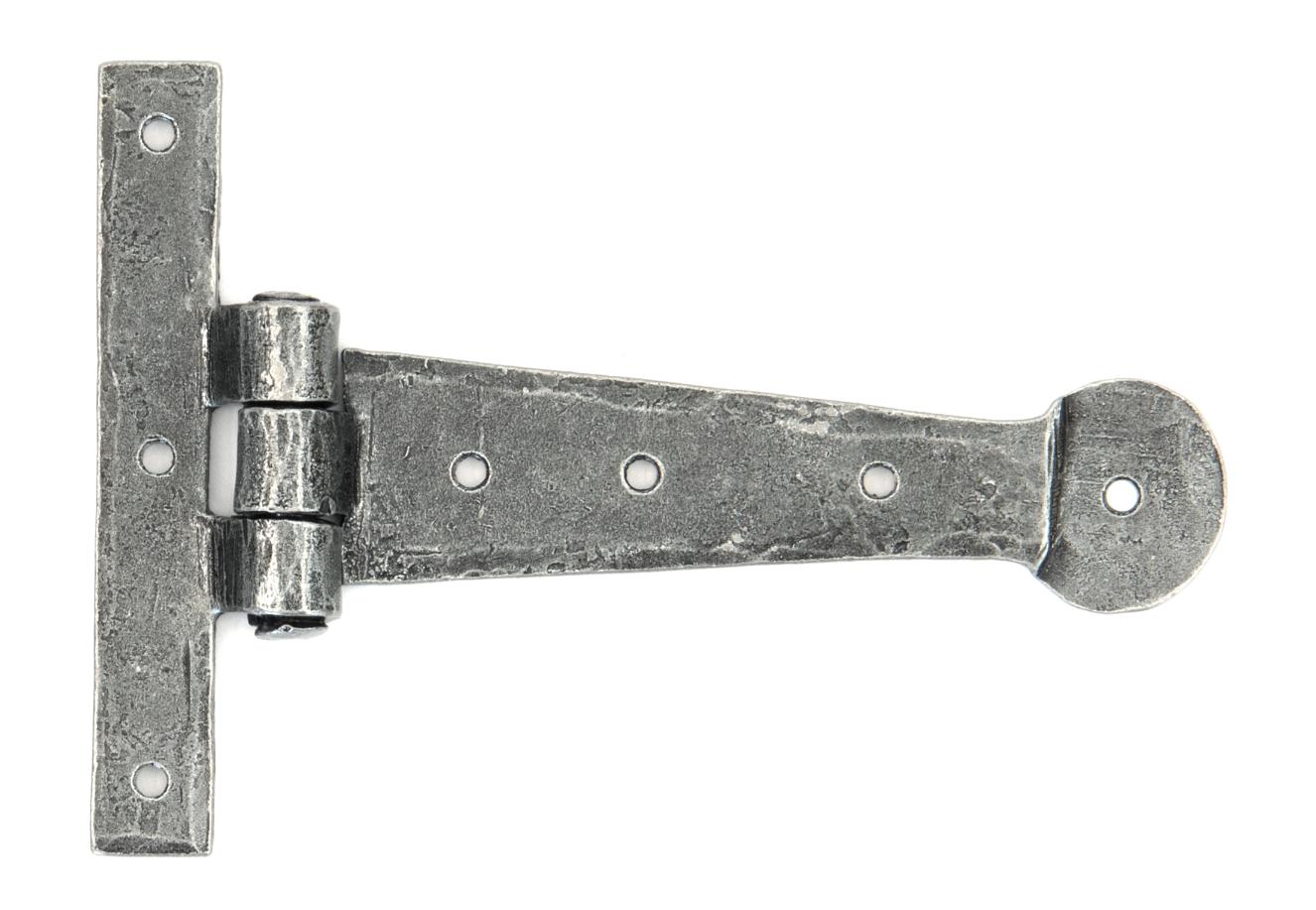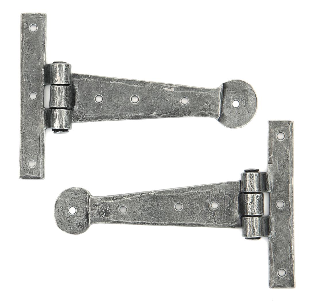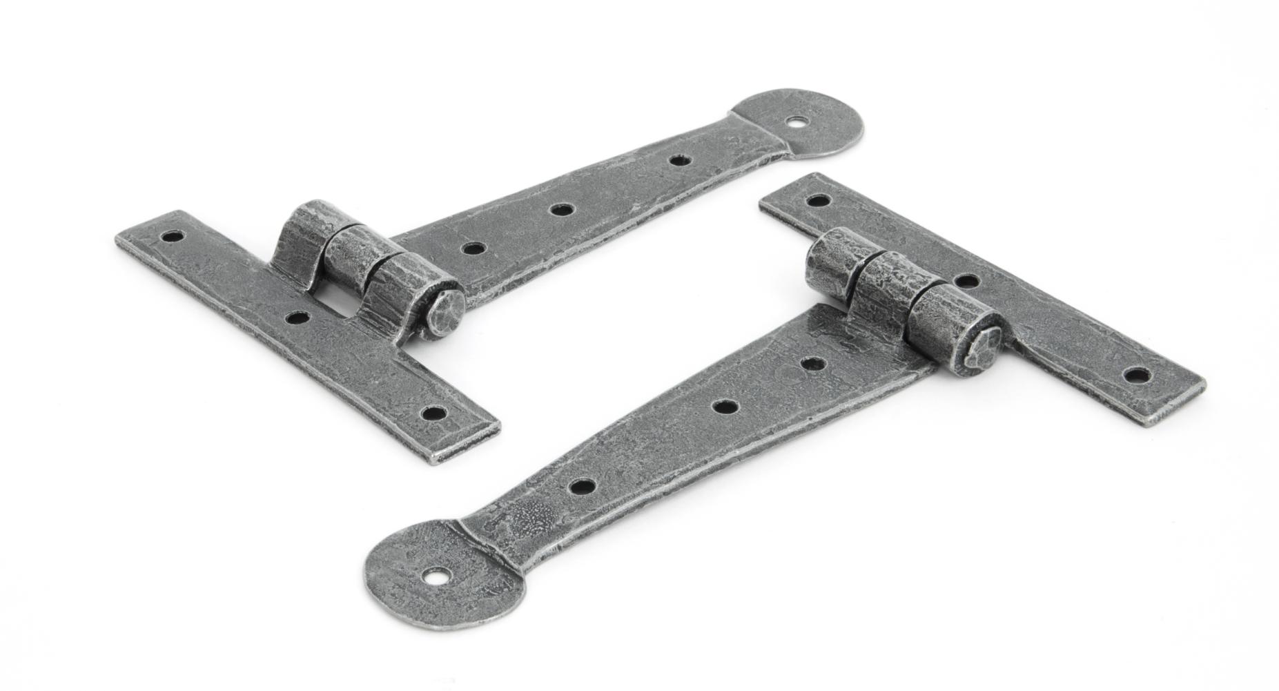Fixing Plate: 102mm x 16mm When opened a t hinge has the appearance of a letter 'T'. An alternative to butt hinges, tee hinges are usually used in conjunction with a suffolk latch on traditional plank doors. Designed to match our bean d handles. Our blacksmith t hinges are hammered into shape from mild steel using the traditional manufacturing method of an anvil and fire. Supplied as a pair. Supplied with matching SS wood screws.