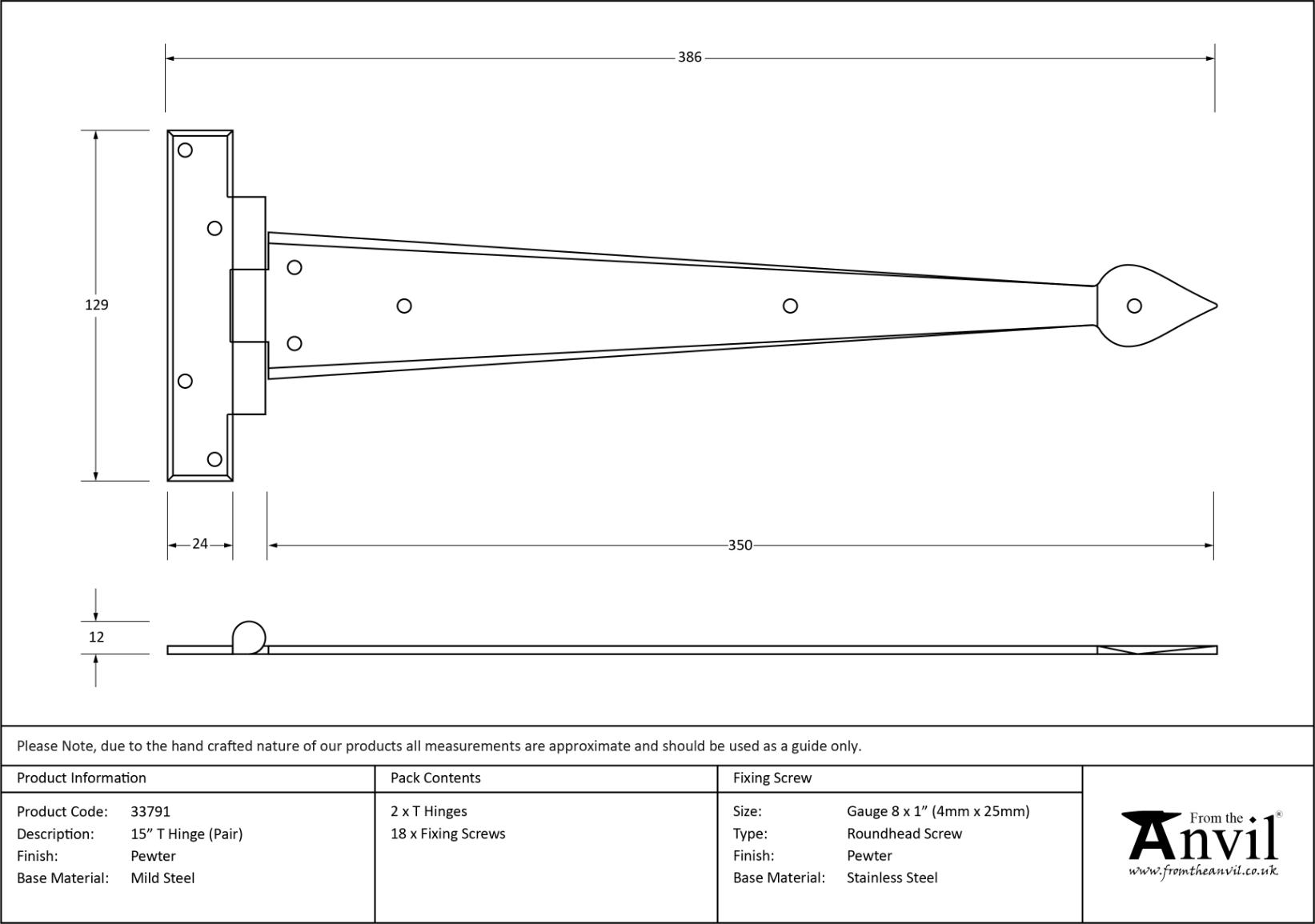 Fixing Plate: 129mm x 24mm When opened a tee hinge has the appearance of a letter 'T'. An alternative to butt hinges, tee hinges are usually used in conjunction with a suffolk latch on traditional plank doors. Designed to match our gothic thumblatches and d handles. A pair and a half (3 hinges) can be fitted to provide extra strength for heavier doors. Our blacksmith tee hinges are hammered into shape from mild steel using the traditional manufacturing method of an anvil and fire. Supplied as a pair. Supplied with matching SS wood screws.