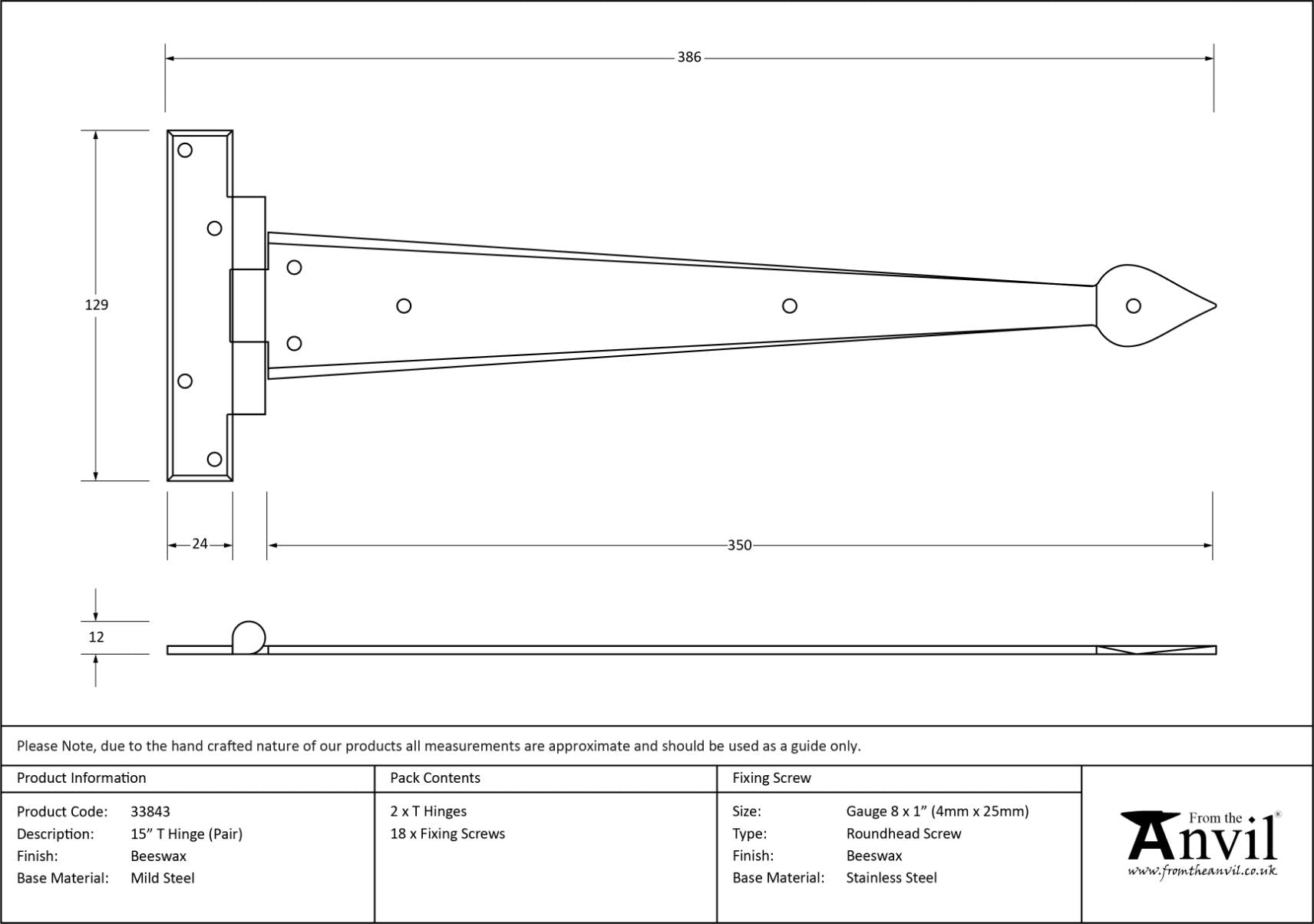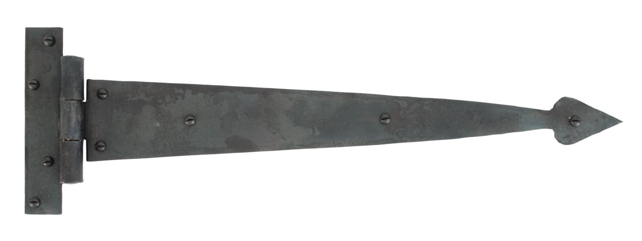 Fixing Plate: 129mm x 24mm When opened a tee hinge has the appearance of a letter 'T'. An alternative to butt hinges, tee hinges are usually used in conjunction with a suffolk latch on traditional plank doors. Designed to match our gothic thumblatches and d handles. A pair and a half (3 hinges) can be fitted to provide extra strength for heavier doors. Our blacksmith tee hinges are hammered into shape from mild steel using the traditional manufacturing method of an anvil and fire. Supplied as a pair. Supplied with matching SS wood screws.