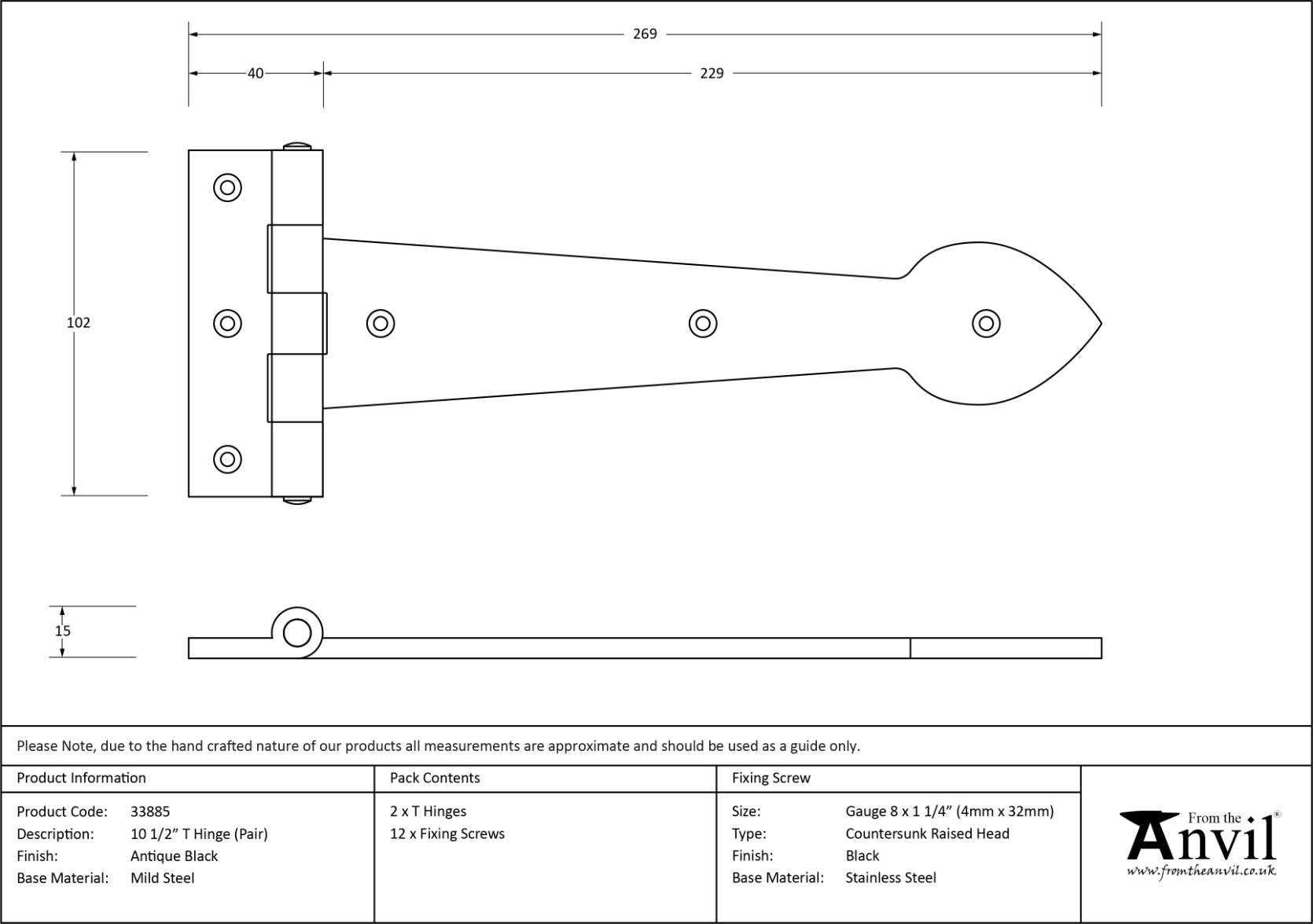 Fixing Plate: 105 x 44mm When opened a tee hinge has the appearance of a letter 'T'. An alternative to butt hinges, tee hinges are usually used in conjunction with a suffolk latch on traditional plank doors. Designed to match our cast thumblatches. A pair and a half (3 hinges) can be fitted to provide extra strength for heavier doors. Supplied as a pair. Supplied with matching SS wood screws.