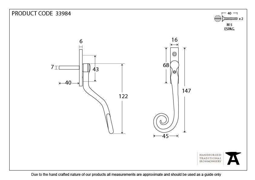 Our range of monkeytail espagnolette fasteners offer a traditional looking product with the benefits of a modern and secure configuration. Designed to fit any type of window, including uPVC and timber due to its slim fixing plate. Can be matched with the monkeytail stays and door handles in the range. The handle is cranked forwards to ensure this protrudes far enough from the window for ease of use. The product is handed and therefore care needs to be taken when choosing the correct hand. From the inside view, if your window is hinged on the right then a right-hand fastener is required. They have a 7mm² x 40mm spindle and can be locked by way of a grub screw. Can be used with an espagnolette gearbox & window lock. Supplied with matching SS M5 screws.