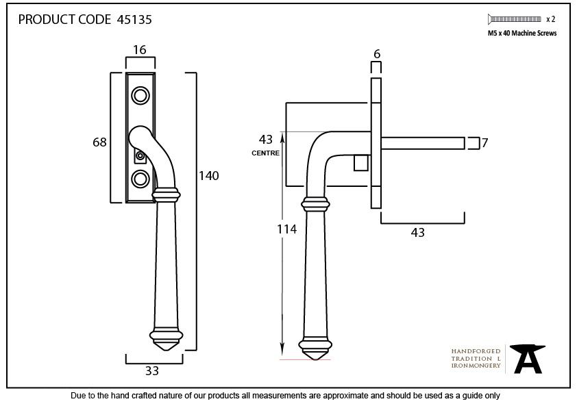 Fixing Centres: 43mm Our regency espagnolette fasteners suit both contemporary or traditional settings, offering all the benefits of a modern and secure configuration. Designed to fit any type of window, including uPVC and timber due to its slim fixing plate. Can be matched with the regency stays and door handles in the range. The handle is cranked forwards to ensure this protrudes far enough from the window for ease of use. The product is handed and therefore care needs to be taken when choosing the correct hand. From the inside view, if your window is hinged on the right then a right-hand fastener is required. They have a 7mm² x 38mm spindle and can be locked by way of a grub screw hidden under the handle. Can be used with an espagnolette gearbox & window lock. Supplied with matching SS M5 screws.
