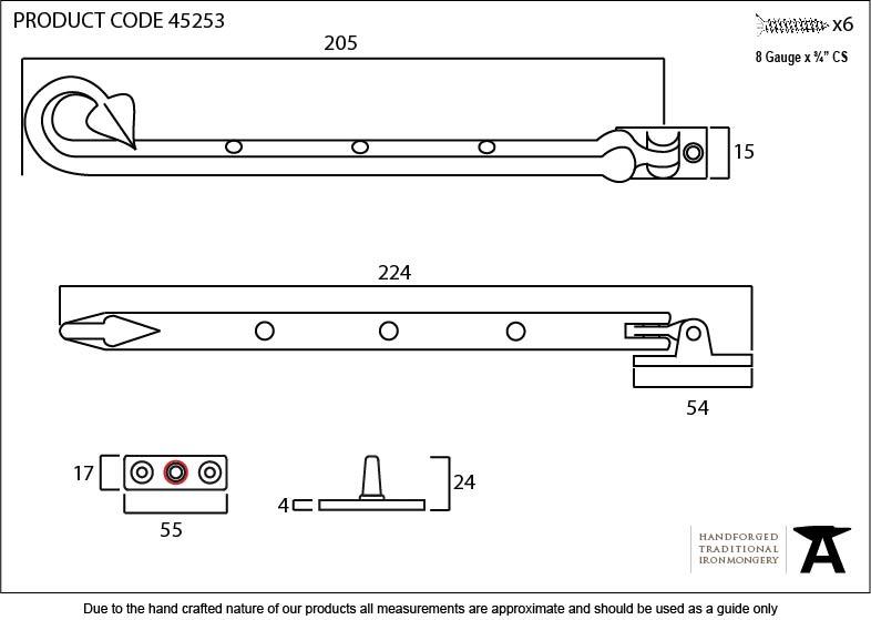 Fixing Plate: 54mm x 15mm A rustic design of window stay. The leaf like shape once again showcases the high skill set of the "From the Anvil" blacksmiths. Designed to match the shropshire window fastener. Available in three different sizes. Supplied with matching SS wood screws.