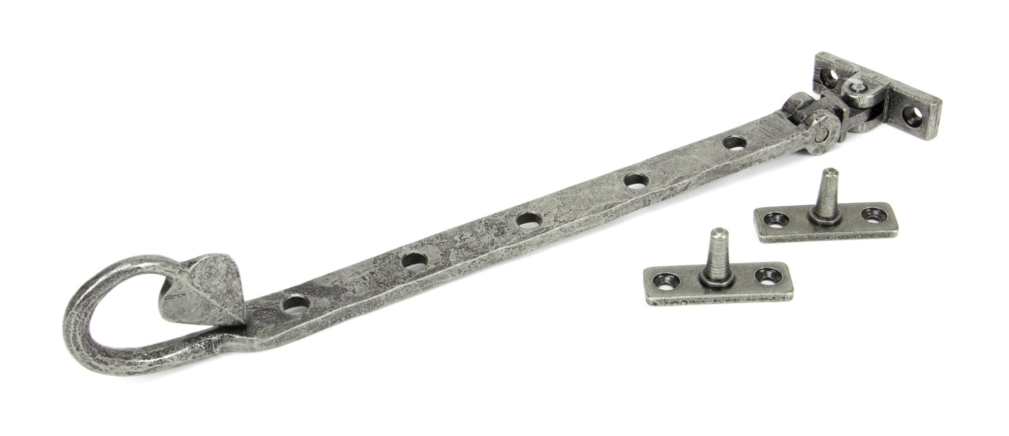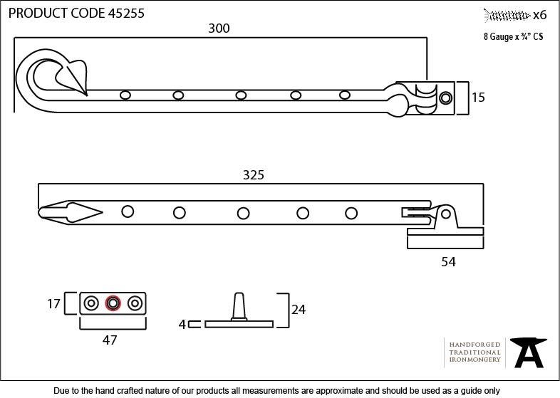 Fixing Plate: 54mm x 15mm A rustic design of window stay. The leaf like shape once again showcases the high skill set of the "From the Anvil" blacksmiths. Designed to match the shropshire window fastener. Available in three different sizes. Supplied with matching SS wood screws.