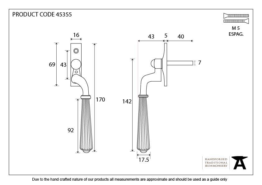 Centres: 43mm The hinton handle is part of the period range of window furniture. A decorative Georgian design that will suit any setting. Our weighty hinton window handle range is forged from solid bronze which emphasises the high quality materials and manufacturing techniques used. A perfect design choice to use throughout your property with many other matching products available. Designed to fit any type of window, including uPVC and timber due to its slim fixing plate. Can be matched with the hinton stays and door handles in the range. The product is handed and therefore care needs to be taken when choosing the correct hand. From the inside view, if your window is hinged on the right then a right-hand fastener is required. They have a 7mm² x 40mm spindle and can be locked by way of a grub screw. Can be used with an espagnolette gearbox & window lock. Supplied with matching SS M5 screws.