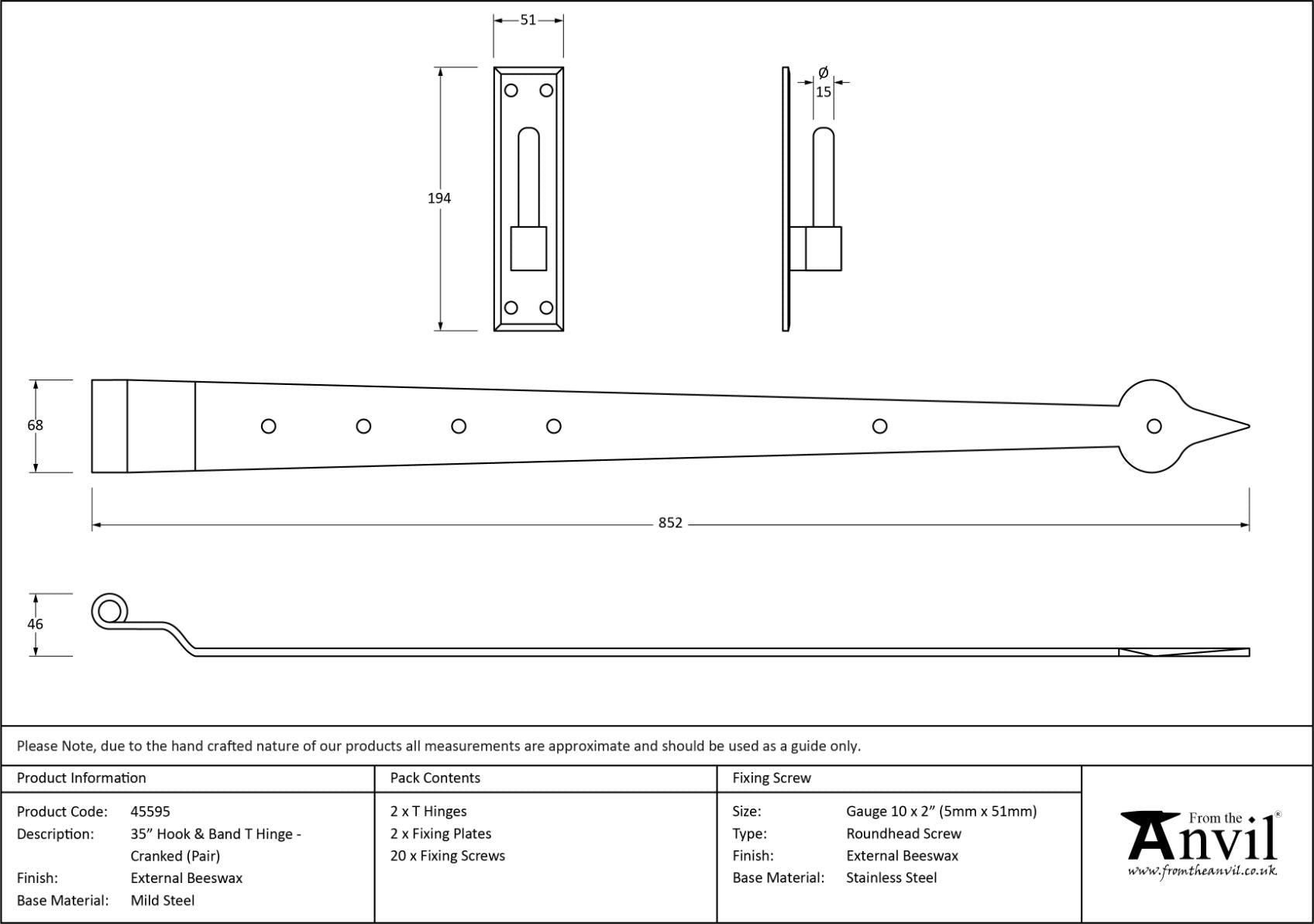 Pin Diameter: 15mm When opened a tee hinge has the appearance of a letter 'T'. An alternative to butt hinges, tee hinges are usually used in conjunction with a suffolk latch on traditional plank doors. Our blacksmith tee hinges are hammered into shape from mild steel using the traditional manufacturing method of an anvil and fire. Band is hinged on the pin attached to the fixing plate. Cranked hinge allows door to be flush with the surface of the frame. Suitable for heavy doors and gates. Supplied as a pair. Supplied with matching SS wood screws.