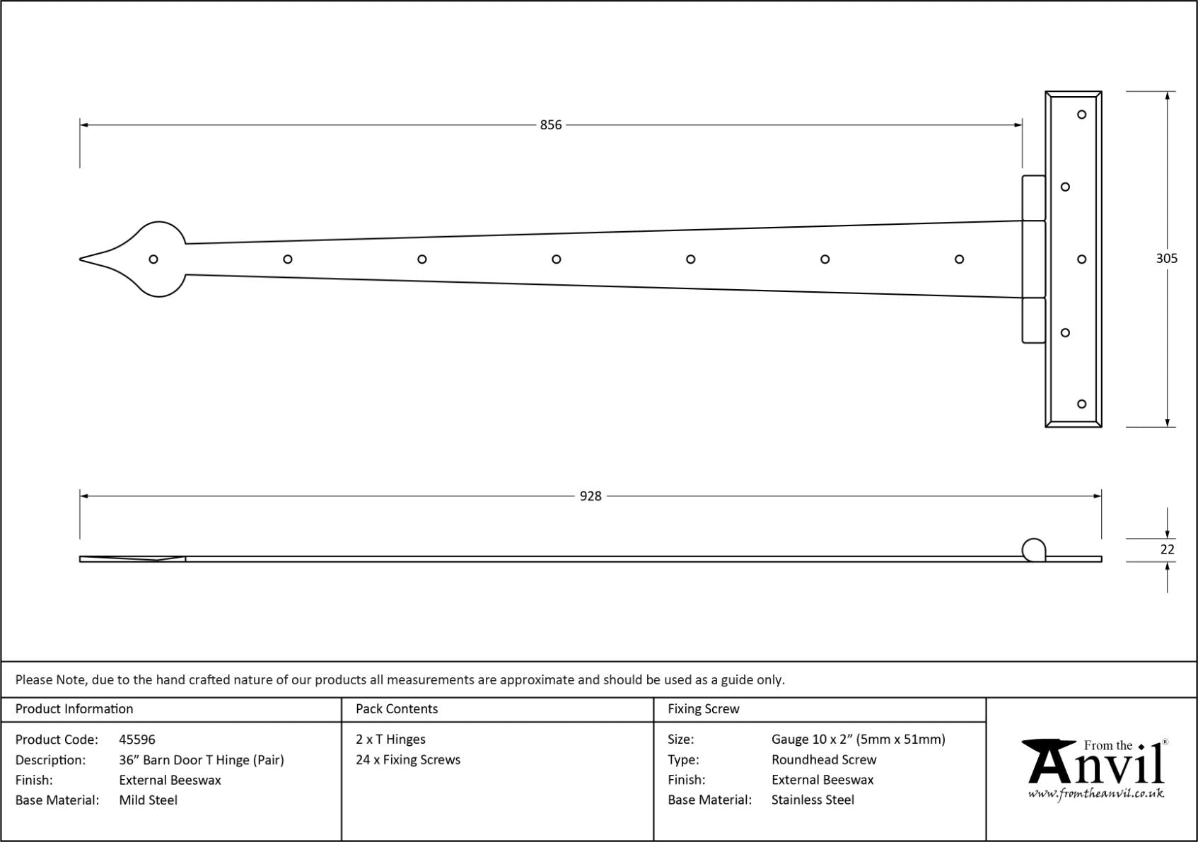 When opened a tee hinge has the appearance of a letter 'T'. An alternative to butt hinges, tee hinges are usually used in conjunction with a suffolk latch on traditional plank doors. Perfect for large garage or barn doors and designed to match our gothic thumblatches and d handles. A pair and a half (3 hinges) can be fitted to provide extra strength for heavier doors. Our blacksmith tee hinges are hammered into shape from mild steel using the traditional manufacturing method of an anvil and fire. Supplied as a pair. Supplied with matching SS wood screws.
