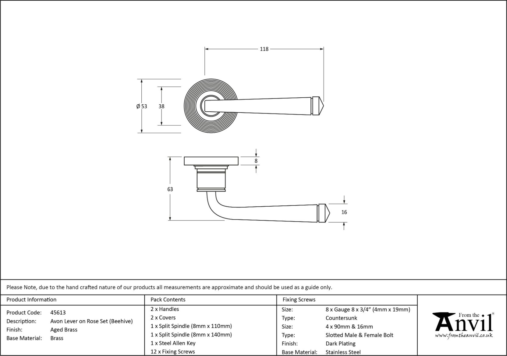Our avon lever handles are our signature design and are extremely popular for their simplicity. The lever is hammered into shape by hand, giving it a contemporary yet individual edge. Designed to match the avon window furniture in the range. This concealed lever handle features a decorative beehive rose which matches a number of other products in our range and adds a contemporary edge to a traditional looking product. The handle has a strong spring incorporated into the concealed boss. Lever handle for internal and external doors where locking is either required or not required. Set includes 2 concealed lever on rose handles. Can be used with a multitude of standard locks, euro locks, latches, escutcheons & thumbturns for various uses within the home. Supplied with matching SS bolt through fixings & SS wood screws.