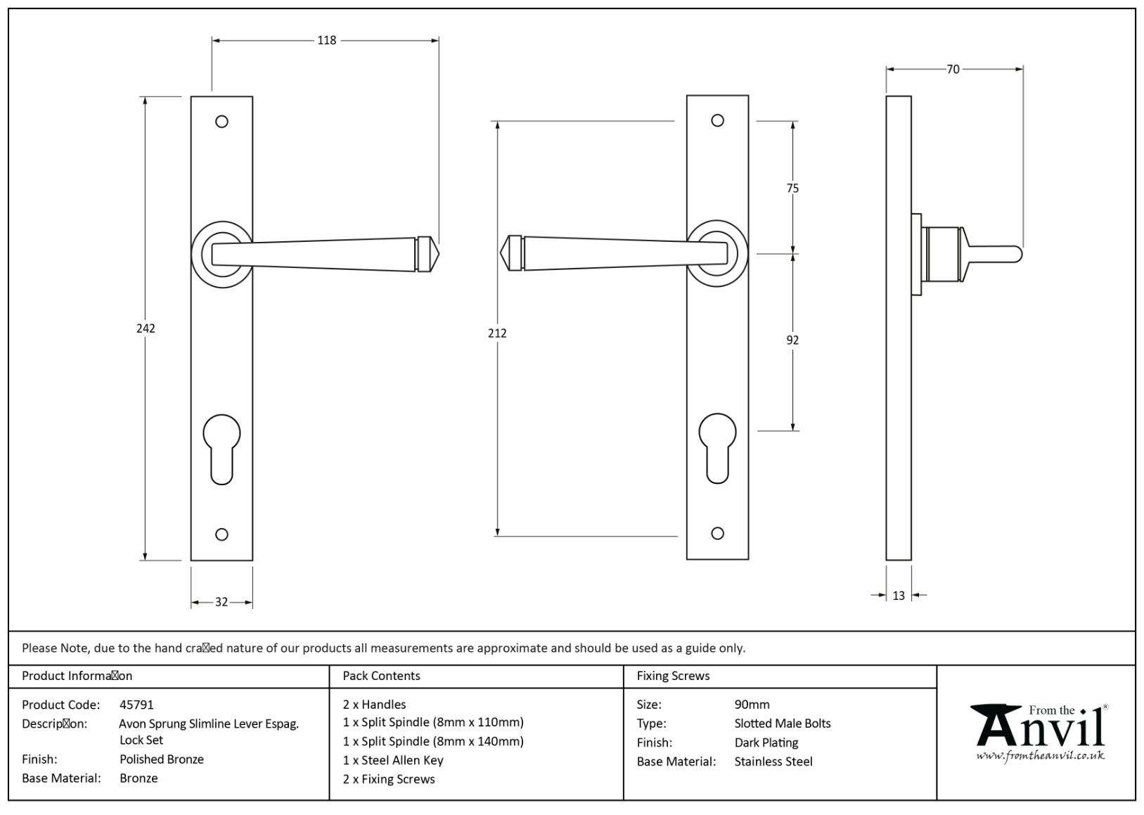 Fixing Centres: 212mm Our avon lever handles are our signature design and are extremely popular for their simplicity. The lever is hammered into shape by hand, giving it a contemporary yet individual edge. Designed to match the avon window furniture in the range. This handle has a strong double spring incorporated into the stylish boss design to give both functionality & elegance. Lever handle for external doors where multi-point locking is required. Set includes an internal and external lever espag lock handle. Can be used with a multi-point lock or french door kit in conjunction with a euro cylinder. Supplied with matching SS bolt through fixings.