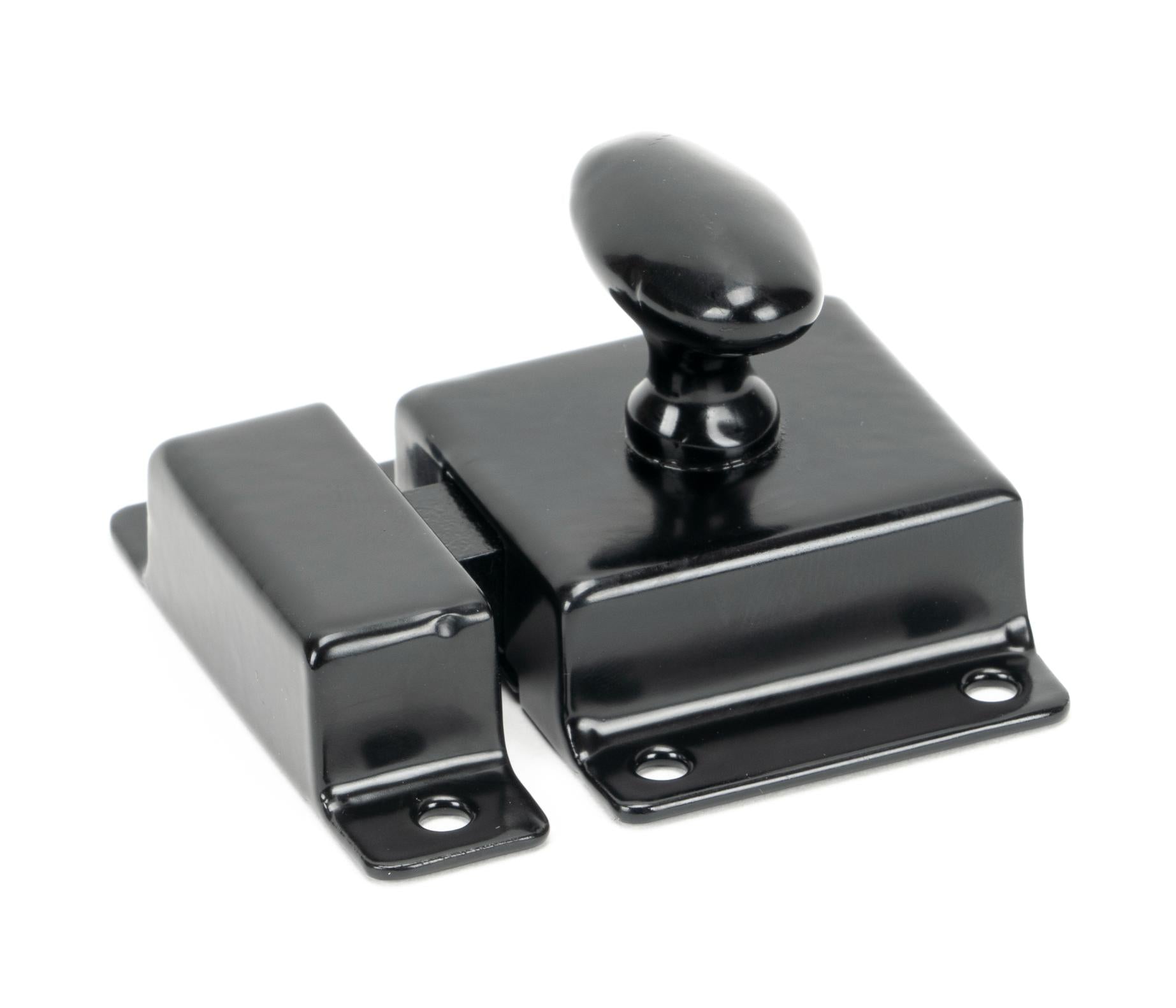 Throw: 9mm Our simple cabinet latch will add the perfect finishing touch to any cupboard or wardrobe doors. The sleek oval knob retracts the sprung latch allowing the doors to be opened. The cabinet latch is part of our blacksmith range of cabinet furniture. Sold in singles. Supplied with matching SS wood screws.
