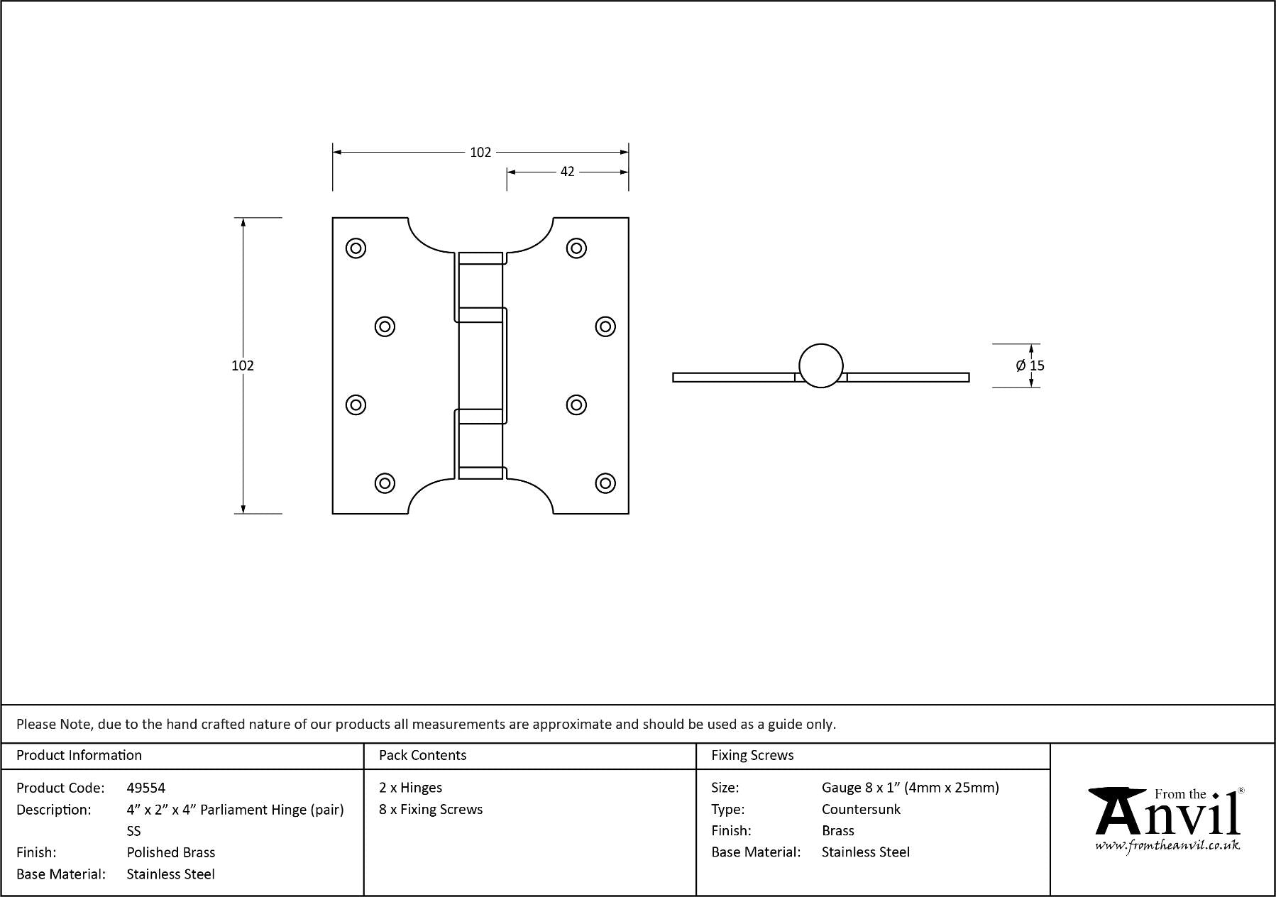Thickness: 3mm Parliament hinges allow the door or window to be projected away from the architrave or frame by 2 inches. Manufactured with ball bearings in the knuckle to provide extra strength and a smooth action that will last for many years. A pair and a half (3 hinges) can be fitted to provide extra strength for heavier doors. Supplied as a pair. Supplied with matching SS wood screws.