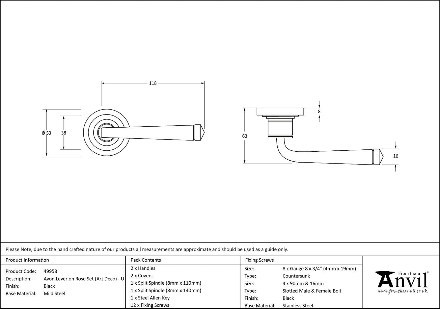 Our avon lever handles are our signature design and are extremely popular for their simplicity. The lever is hammered into shape by hand, giving it a contemporary yet individual edge. Designed to match the avon window furniture in the range. This concealed lever handle features a stepped art deco rose which matches a number of other products in our range and adds a contemporary edge to a traditional looking product. The handle is unsprung and is available on a 2 week lead time. Lever handle for internal and external doors where locking is either required or not required. Set includes 2 concealed lever on rose handles. Can be used with a multitude of standard locks, euro locks, multipoint locks, latches, escutcheons & thumbturns for various uses within the home. Supplied with matching SS bolt through fixings & SS wood screws.
