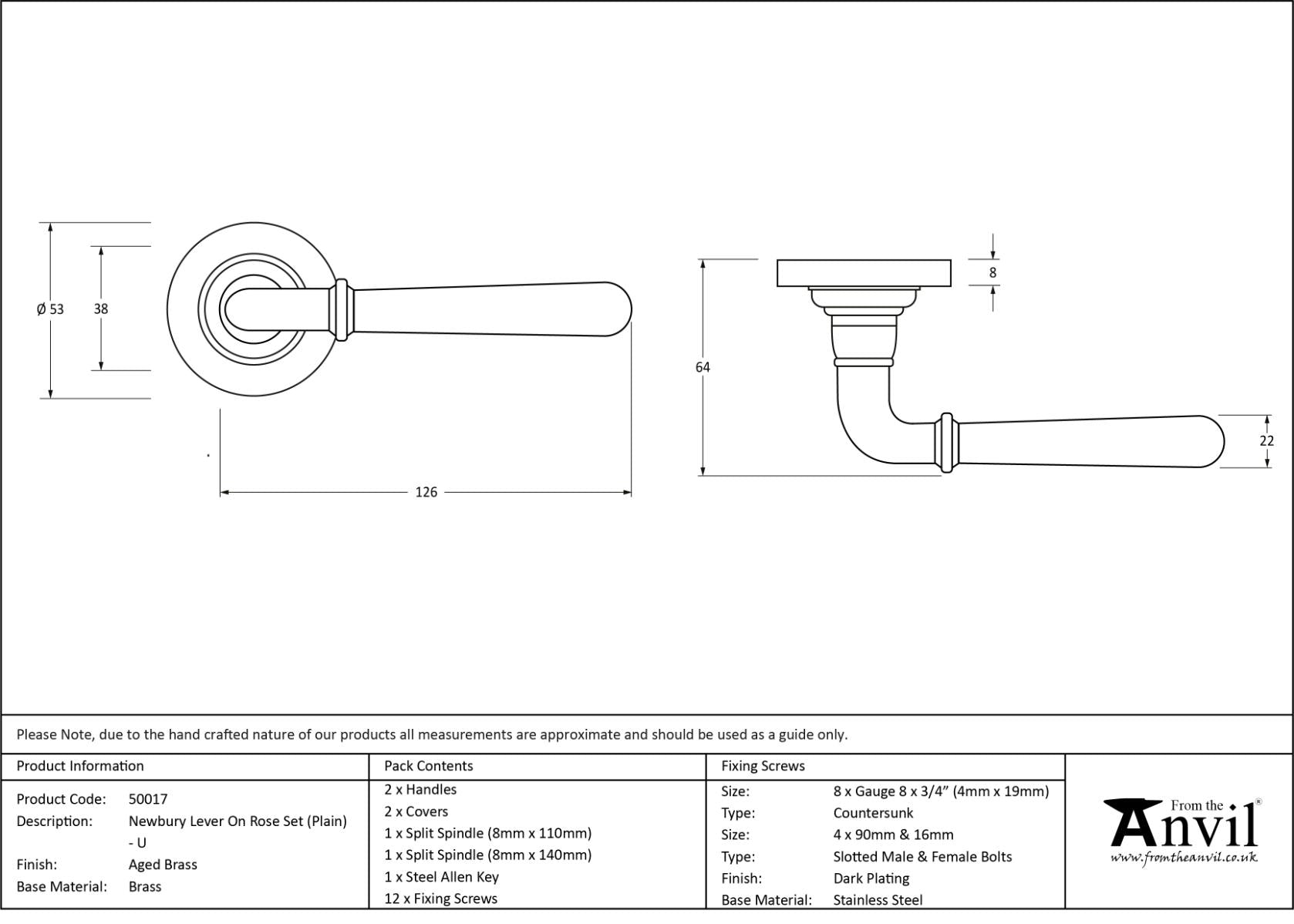 The newbury set is part of the period range of lever handles. The simple and slender design fits well into many different property types. Our weighty newbury lever handle range is forged from solid brass which emphasises the high quality materials and manufacturing techniques used. A perfect design choice to use throughout your property with many other matching products available. This concealed lever handle features a simple plain rose which adds a contemporary edge to a traditional looking product. The handle is unsprung and is available on a 2 week lead time. Lever handle for internal and external doors where locking is either required or not required. Set includes 2 concealed lever on rose handles. Can be used with a multitude of standard locks, euro locks, multipoint locks, latches, escutcheons & thumbturns for various uses within the home. Supplied with matching SS bolt through fixings & SS wood screws.
