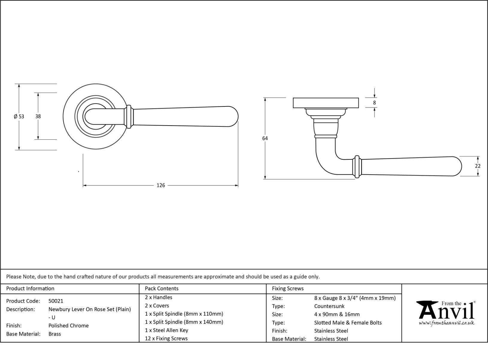 The newbury set is part of the period range of lever handles. The simple and slender design fits well into many different property types. Our weighty newbury lever handle range is forged from solid brass which emphasises the high quality materials and manufacturing techniques used. A perfect design choice to use throughout your property with many other matching products available. This concealed lever handle features a simple plain rose which adds a contemporary edge to a traditional looking product. The handle is unsprung and is available on a 2 week lead time. Lever handle for internal and external doors where locking is either required or not required. Set includes 2 concealed lever on rose handles. Can be used with a multitude of standard locks, euro locks, multipoint locks, latches, escutcheons & thumbturns for various uses within the home. Supplied with matching SS bolt through fixings & SS wood screws.