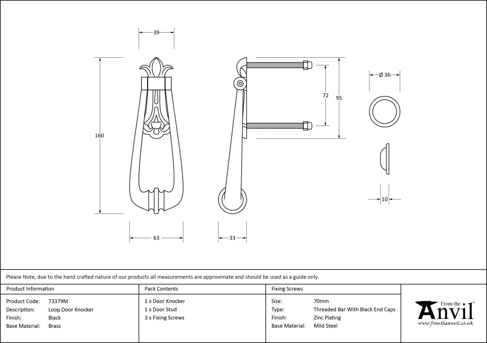 Stud: 40 Dia Our extensive selection of door knockers suit a variety of doors from timber, composite, upvc and aluminium offering both traditional and contemporary designs. Our loop door knocker is forged from solid brass which emphasises the high quality materials and manufacturing techniques used. A perfect design choice for external doors with matching products available. Fixed to your door using a bolt-through fixing for the knocker and strike plate, which is finished with a dome head cap on the internal side of the door. Supplied with matching 70mm stainless steel threaded bars and dome headed caps.