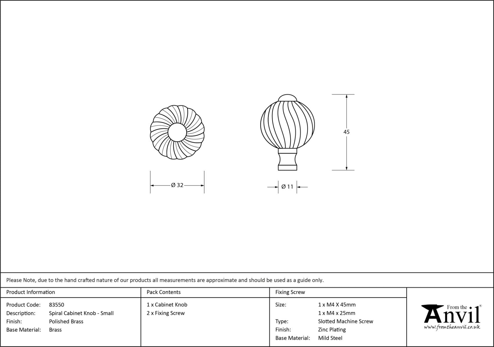 Projection: 45mm The spiral cabinet knob is part of the period range of cabinet knobs. Our spiral cabinet knob is forged from solid brass which emphasises the high quality materials and manufacturing techniques used. A perfect design choice for kitchen drawers with matching products available. They are suitable for cupboards, doors and drawers. Available in three different sizes. Sold in singles. Supplied with an SS M4 screw.