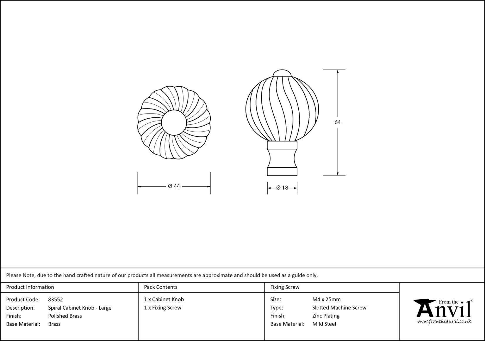 Projection: 66mm The spiral cabinet knob is part of the period range of cabinet knobs. Our spiral cabinet knob is forged from solid brass which emphasises the high quality materials and manufacturing techniques used. A perfect design choice for kitchen drawers with matching products available. They are suitable for cupboards, doors and drawers. Available in three different sizes. Sold in singles. Supplied with an SS M4 screw.