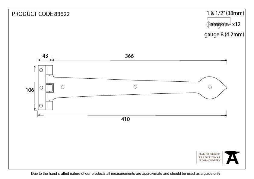 Fixing Plate: 105 x 44mm When opened a tee hinge has the appearance of a letter 'T'. An alternative to butt hinges, tee hinges are usually used in conjunction with a suffolk latch on traditional plank doors. Designed to match our cast thumblatches. A pair and a half (3 hinges) can be fitted to provide extra strength for heavier doors. Supplied as a pair. Supplied with matching SS wood screws.