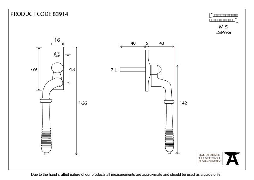 Fixing Plate Size: 69mm x 16mm x 5mm The reeded handle is part of the period range of window furniture. A classic regency design with a stylish reeded end that will suit both traditional and contemporary settings. Our weighty reeded window handle range is forged from solid brass which emphasises the high quality materials and manufacturing techniques used. A perfect design choice to use throughout your property with many other matching products available. Designed to fit any type of window, including uPVC and timber due to its slim fixing plate. Can be matched with the reeded stays and door handles in the range. The product is handed and therefore care needs to be taken when choosing the correct hand. From the inside view, if your window is hinged on the left then a left-hand fastener is required. They have a 7mm² x 40mm spindle and can be locked by way of a grub screw. Can be used with an espagnolette gearbox & window lock. Supplied with matching SS M5 screws.