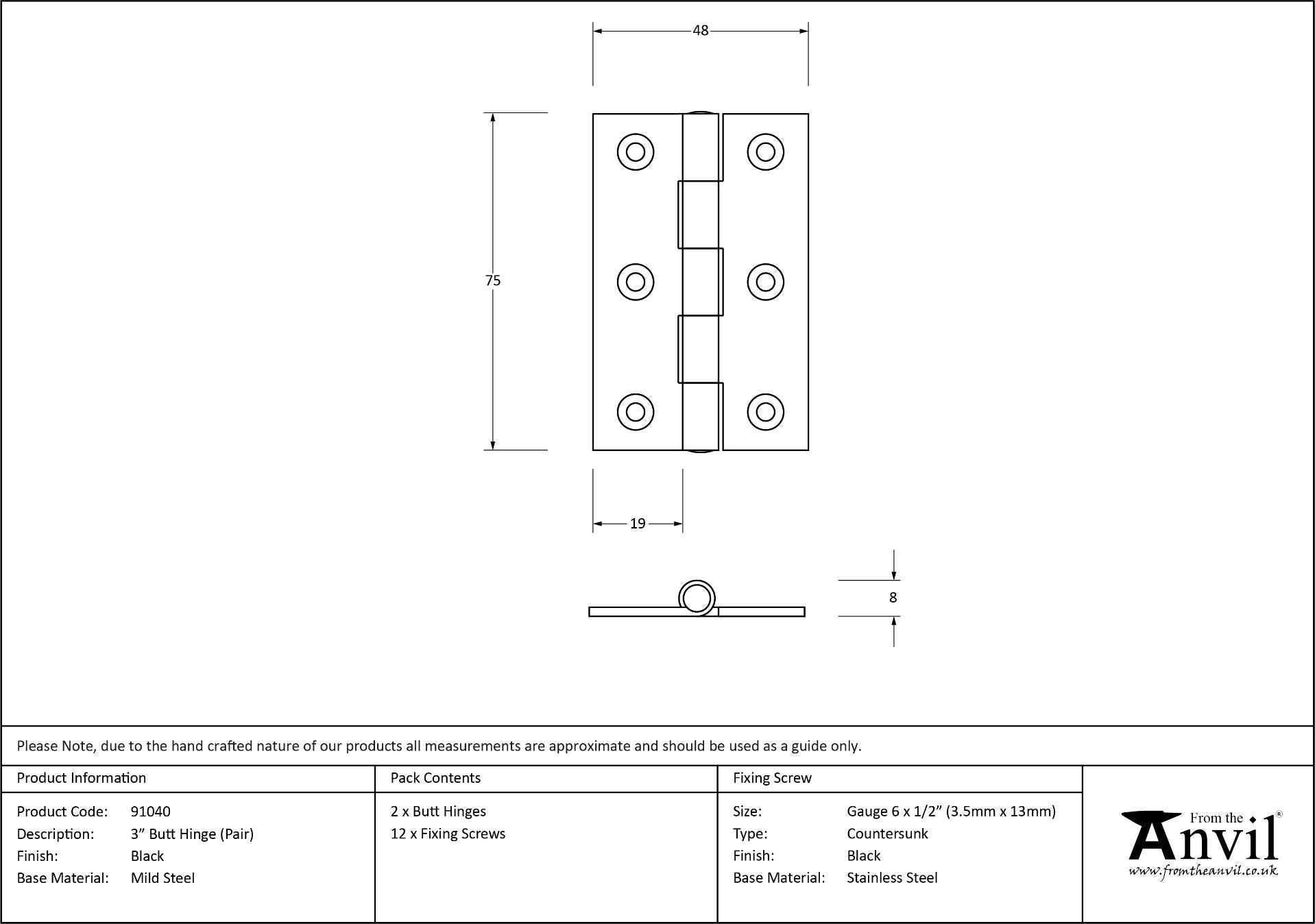 Thickness: 2.5mm A simple butt hinge manufactured from steel, perfect for hanging a variety of doors and windows. A pair and a half (3 hinges) can be fitted to provide extra strength for heavier doors. Can be used with matching hinge fronts to give a traditional look and feel to an existing or new door. Supplied as a pair. Supplied with matching SS wood screws.