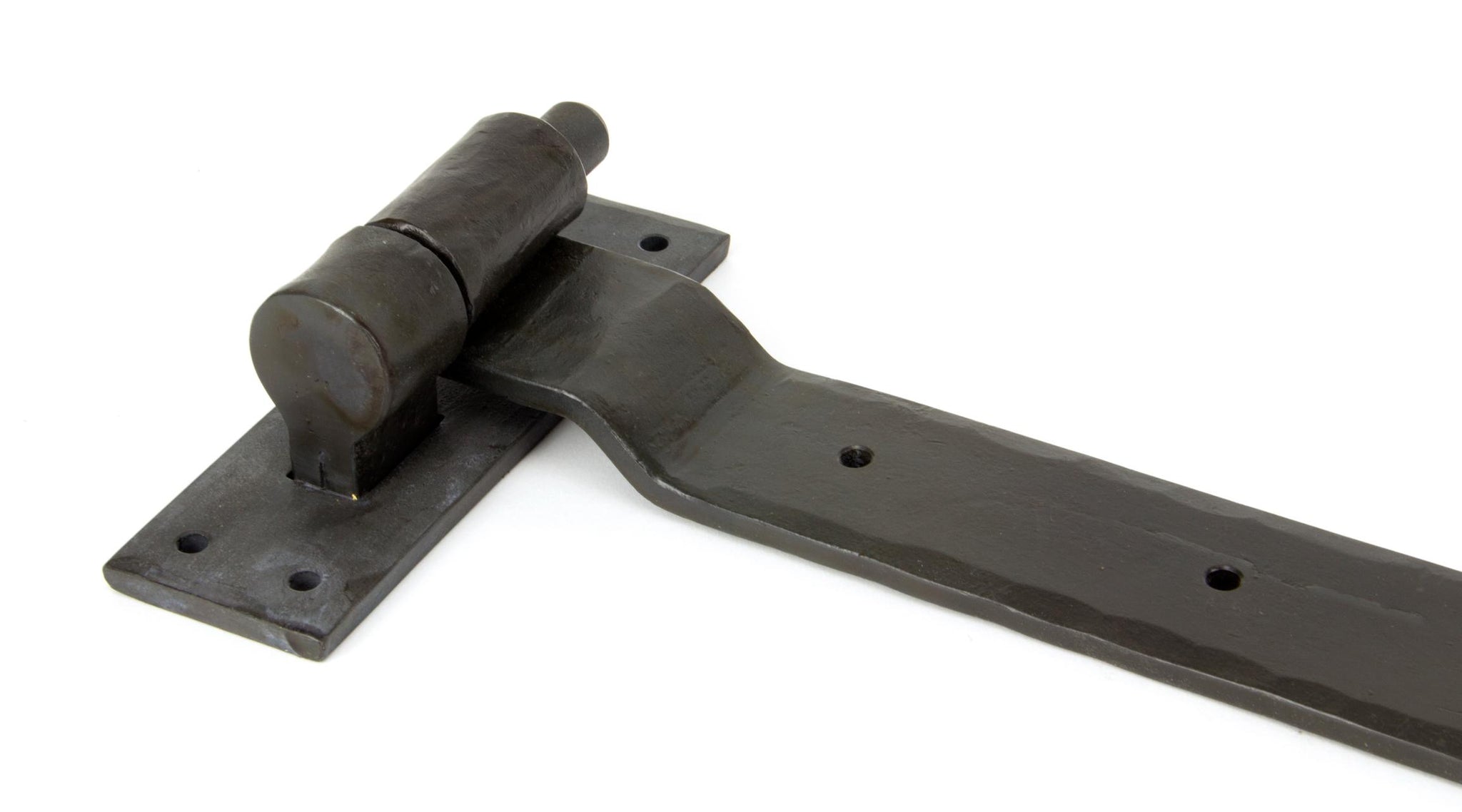 Pin Diameter: 15mm When opened a tee hinge has the appearance of a letter 'T'. An alternative to butt hinges, tee hinges are usually used in conjunction with a suffolk latch on traditional plank doors. Our blacksmith tee hinges are hammered into shape from mild steel using the traditional manufacturing method of an anvil and fire. Band is hinged on the pin attached to the fixing plate. Cranked hinge allows door to be flush with the surface of the frame. Suitable for heavy doors and gates. Supplied as a pair. Supplied with matching SS wood screws.