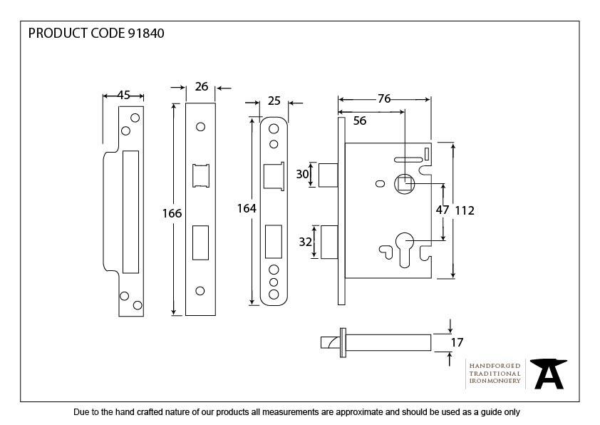 Forend Size: 166mm (L) x 26mm (W) British Standard (BS EN 12209) rated and CE and Certifire tested euro sash lock. For use with any of our 47mm centre euro lever handles. Must be used in conjunction with a euro cylinder or euro thumbturn cylinder. Will match any of our aged brass or polished brass lever handles. For matching rebate kit please use product code 91841. Supplied with matching SS wood screws.