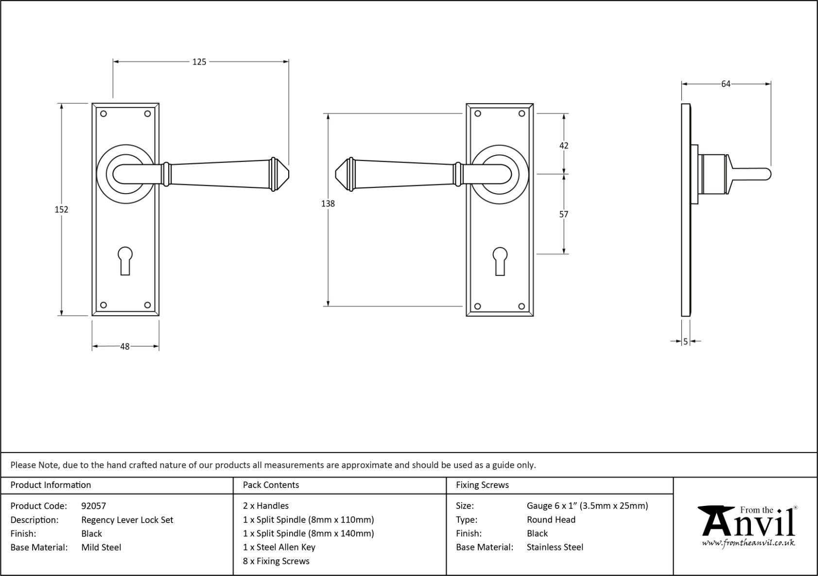Centres: 57mm Our regency lever collection is a popular choice for many properties and features a simple square edged backplate, which is complemented with a smooth rounded lever. Designed to match the regency window furniture in the range. This handle has a strong spring incorporated into the stylish boss design to give both functionality & elegance. Lever handle for internal and external doors where locking is required. Set includes 2 lever lock handles. Can be used with a 5 lever sash Lock BS. Supplied with matching SS wood screws.